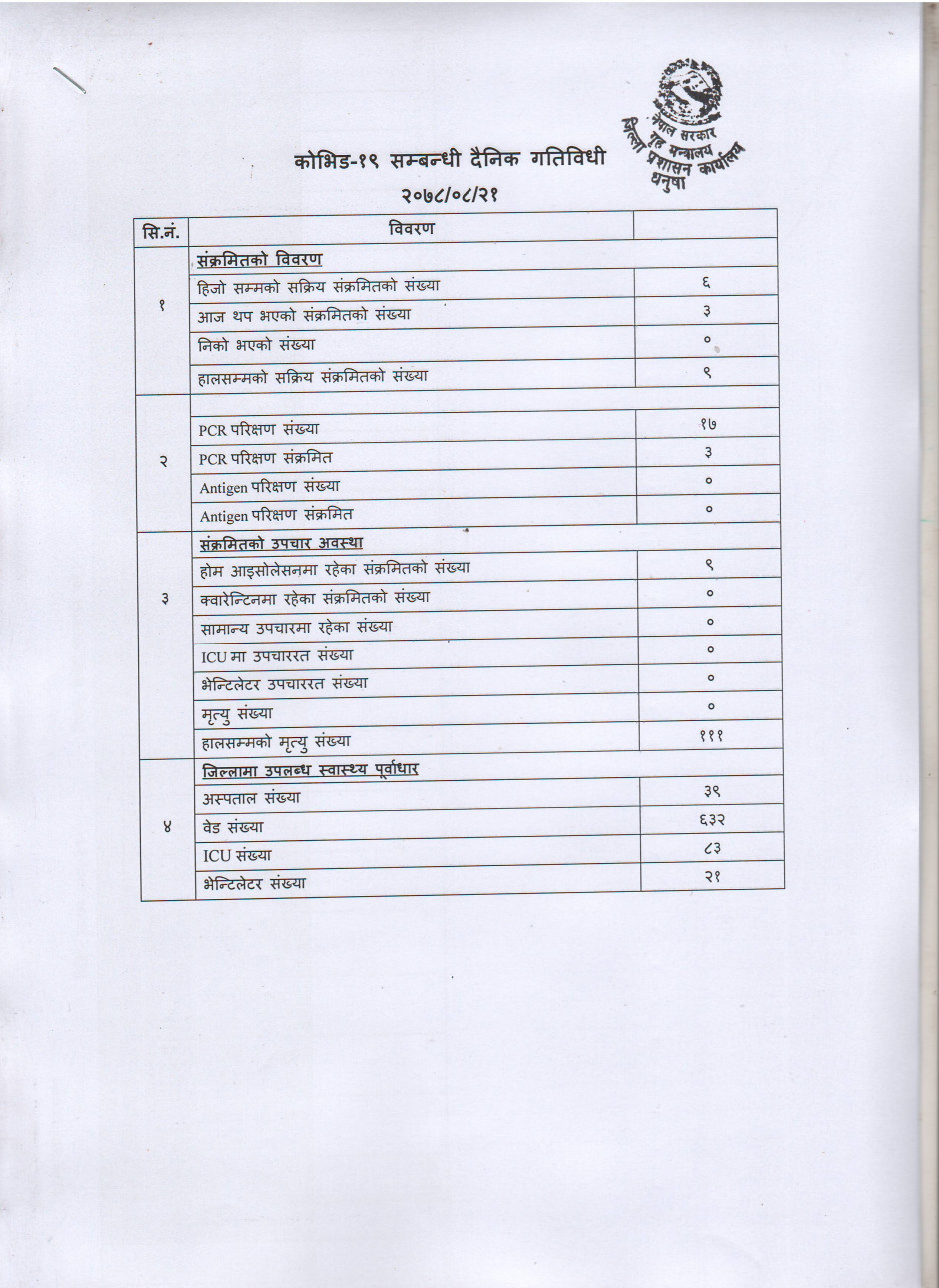 २०७८/०८/२१ काेभिड १९ सम्बन्धी दैनिक गतिविधी