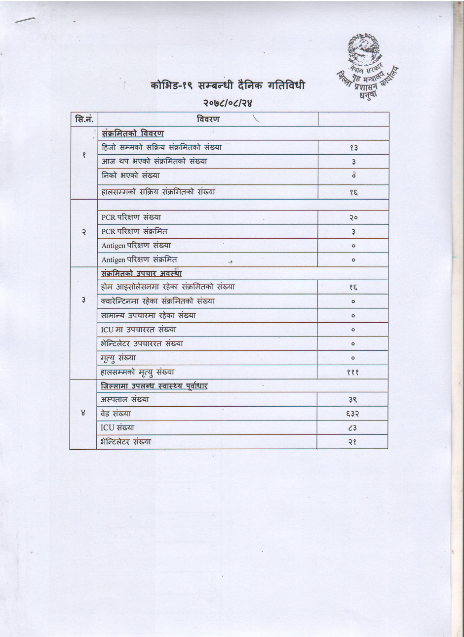 २०७८/०८/२४ काेभिड १९ सम्बन्धी दैनिक गतिविधी
