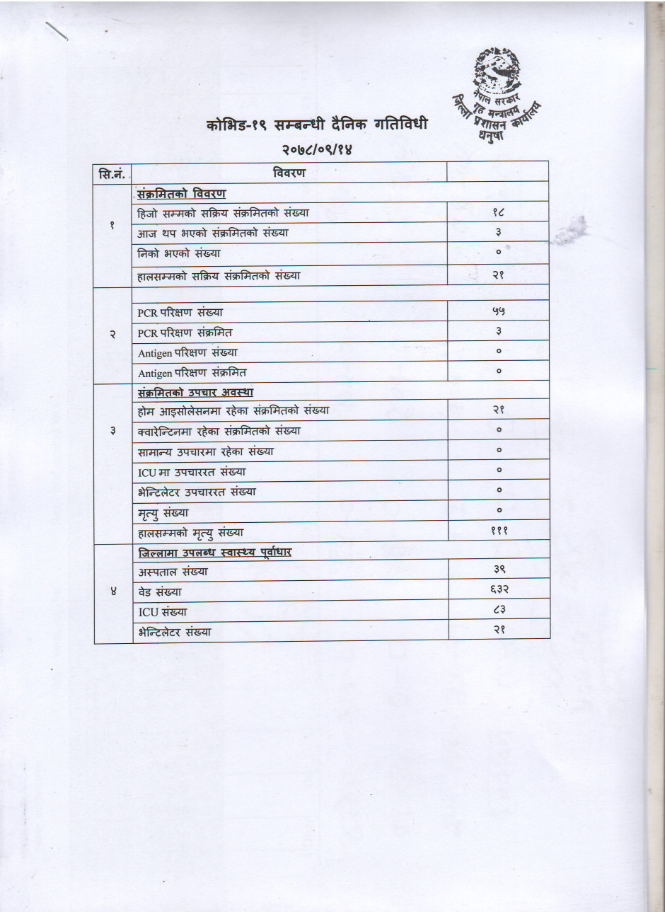 २०७८/०९/१४ काेभिड १९ सम्बन्धी दैनिक गतिविधी