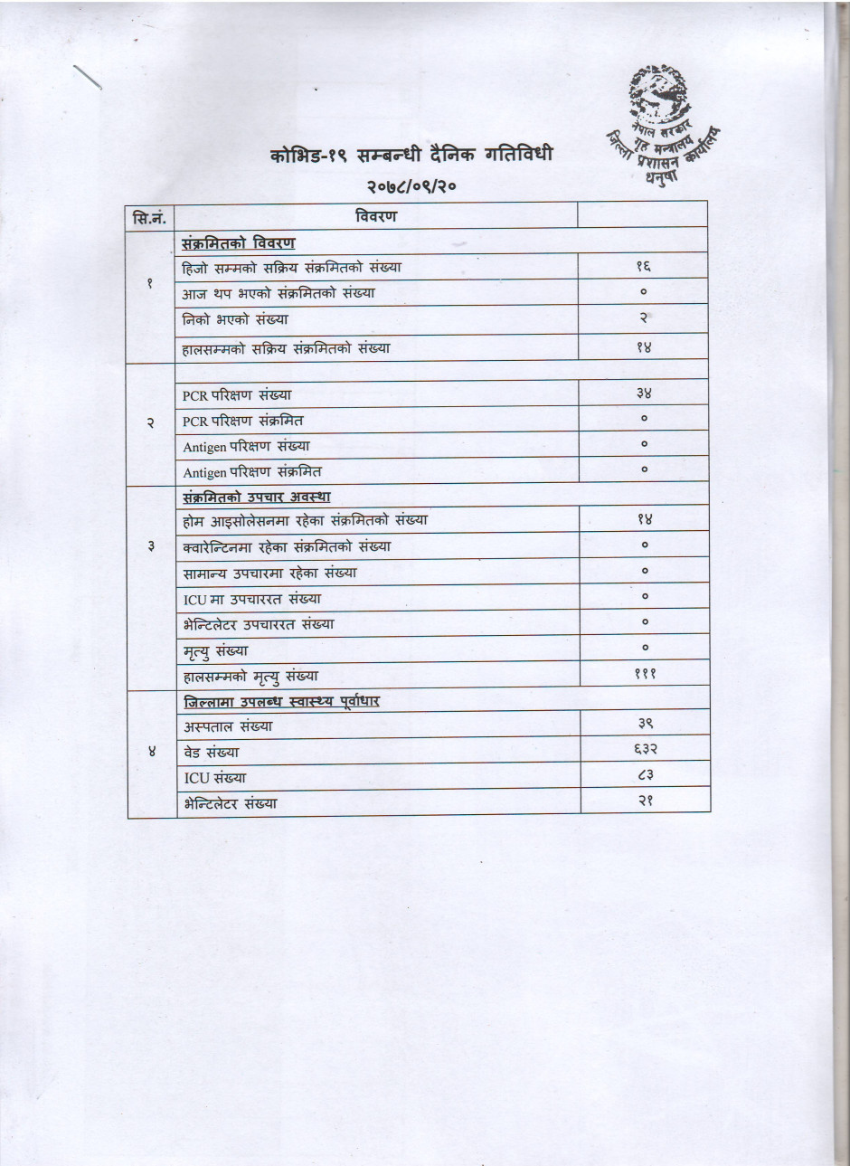 २०७८/०९/२० काेभिड १९ सम्बन्धी दैनिक गतिविधी