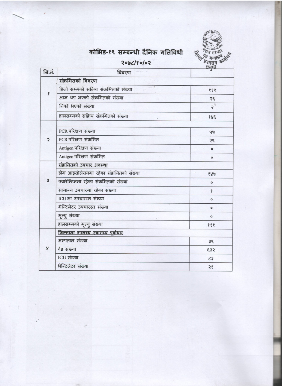 २०७८/१०/०२ काेभिड १९ सम्बन्धी दैनिक गतिविधी