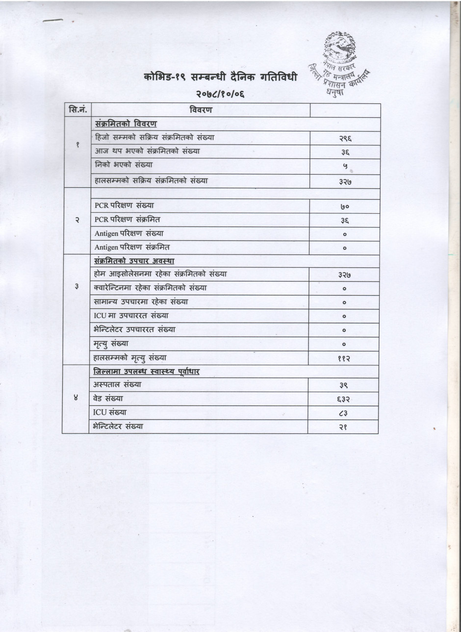 २०७८/१०/०६ काेभिड १९ सम्बन्धी दैनिक गतिविधी