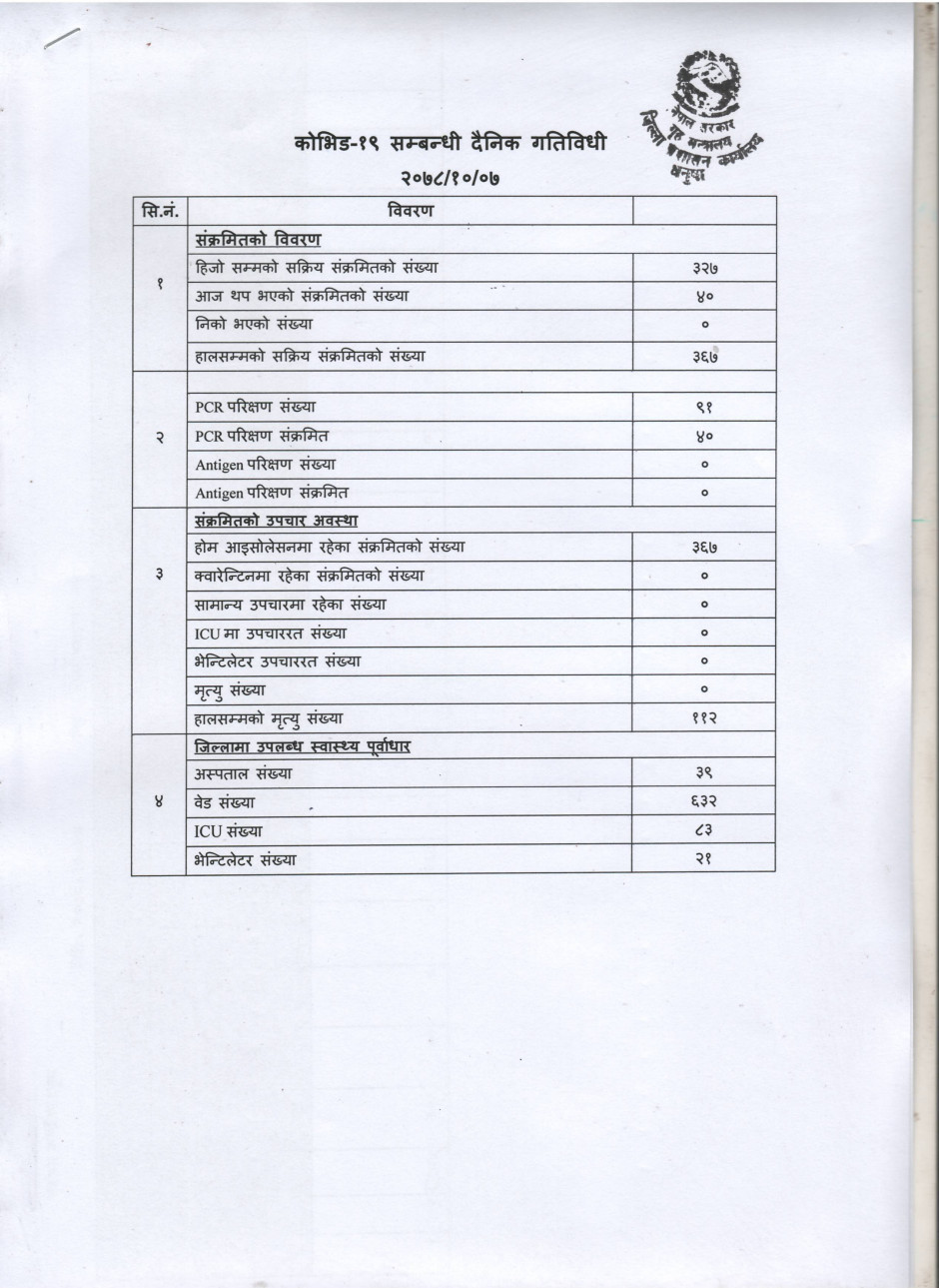 २०७८/१०/०७ काेभिड १९ सम्बन्धी दैनिक गतिविधी