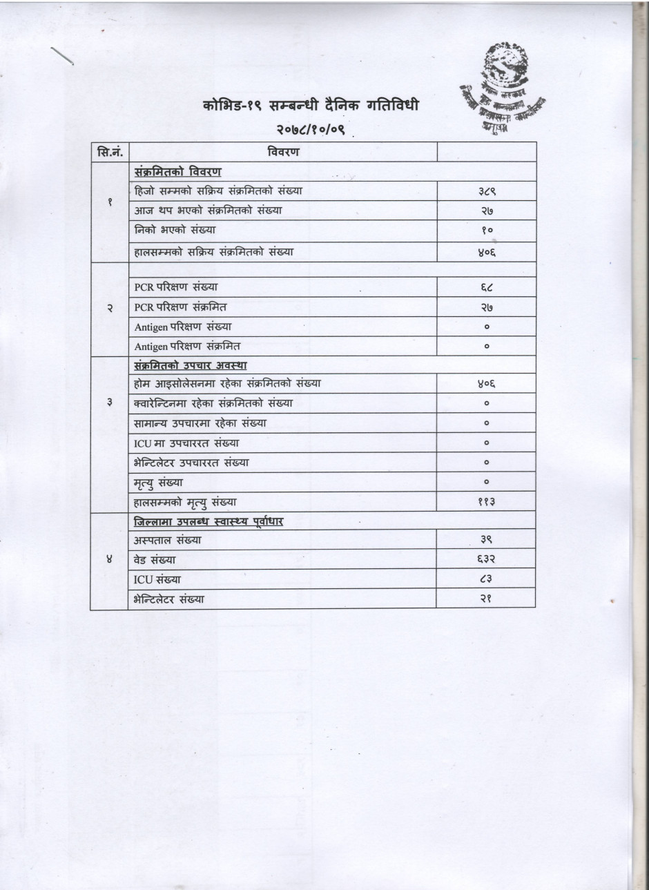 २०७८/१०/०९ काेभिड १९ सम्बन्धी दैनिक गतिविधी