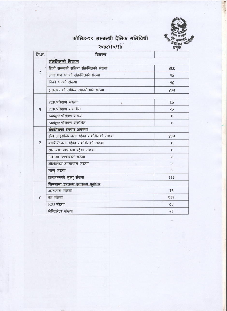 २०७८/१०/१७ काेभिड १९ सम्बन्धी दैनिक गतिविधी
