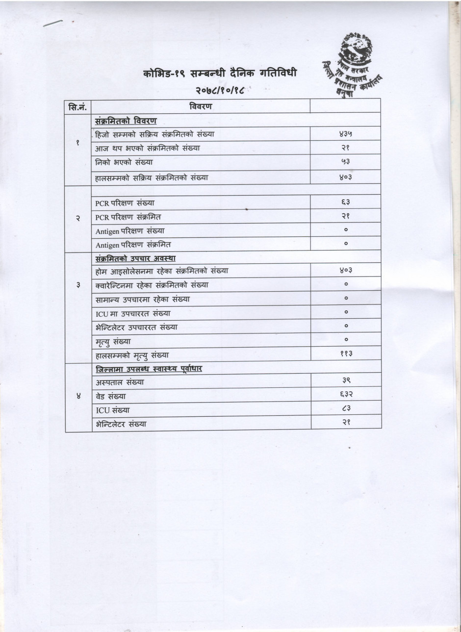 २०७८/१०/१८ काेभिड १९ सम्बन्धी दैनिक गतिविधी