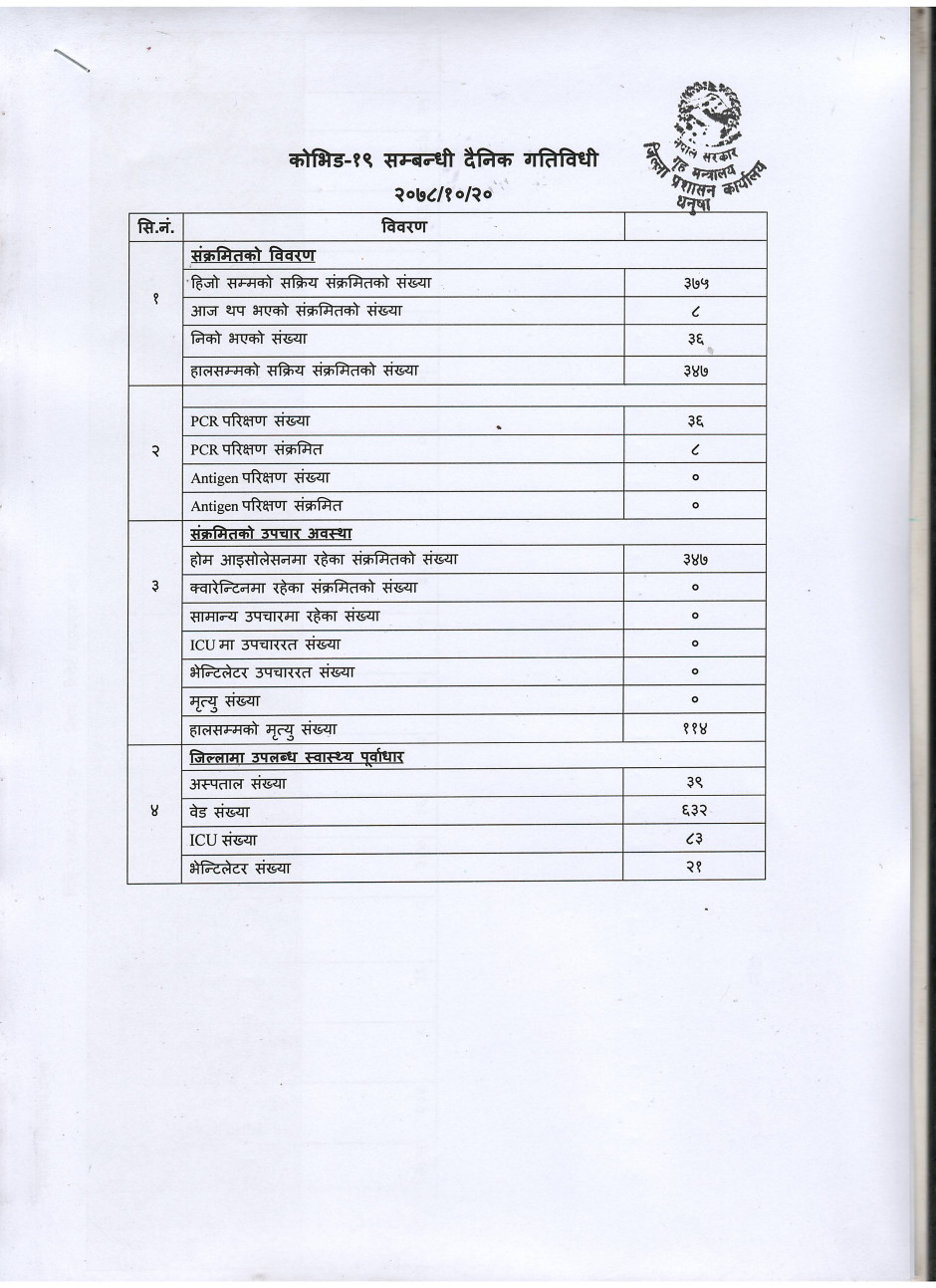 २०७८/१०/२० काेभिड १९ सम्बन्धी दैनिक गतिविधी