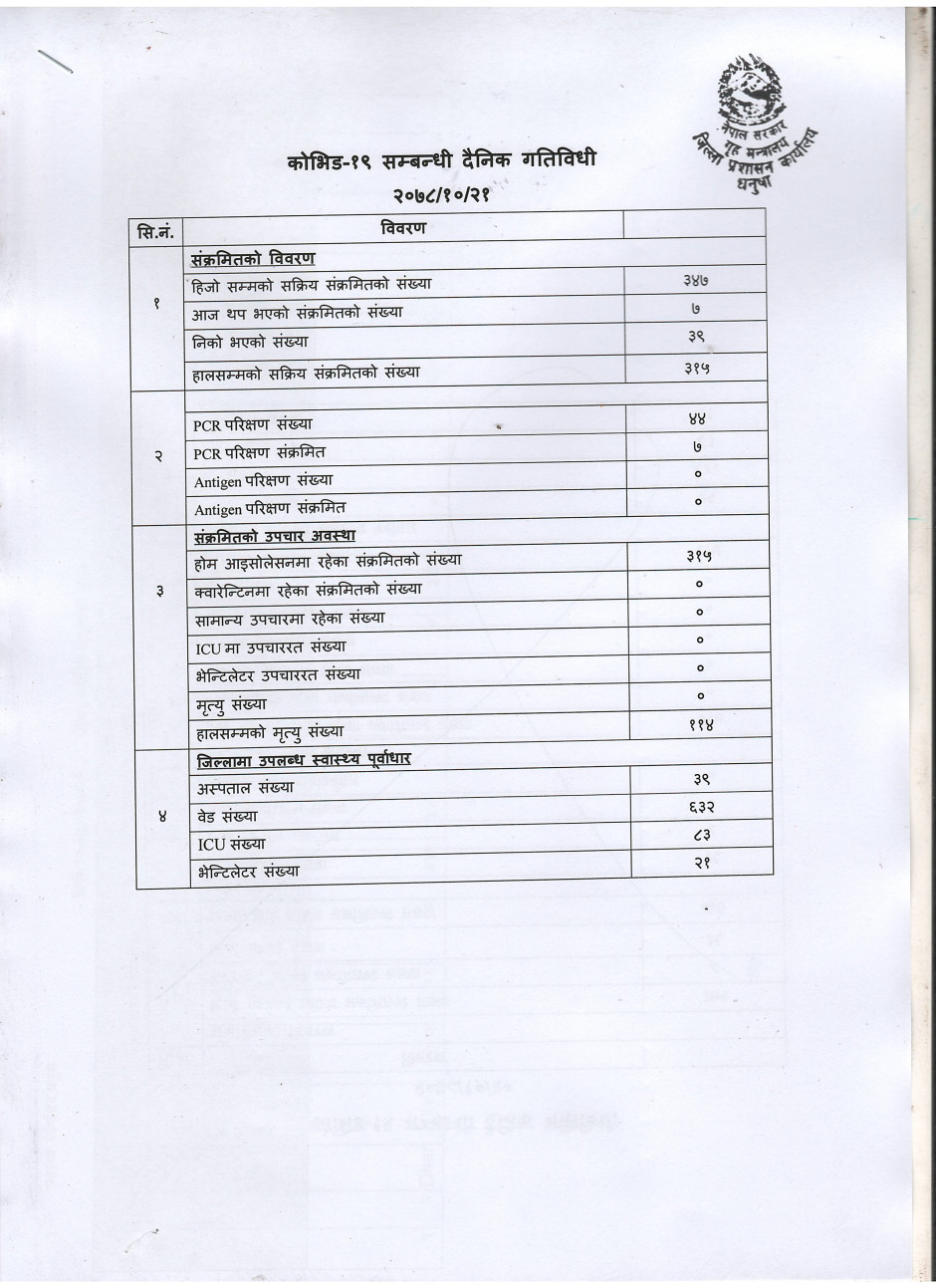२०७८/१०/२१ काेभिड १९ सम्बन्धी दैनिक गतिविधी