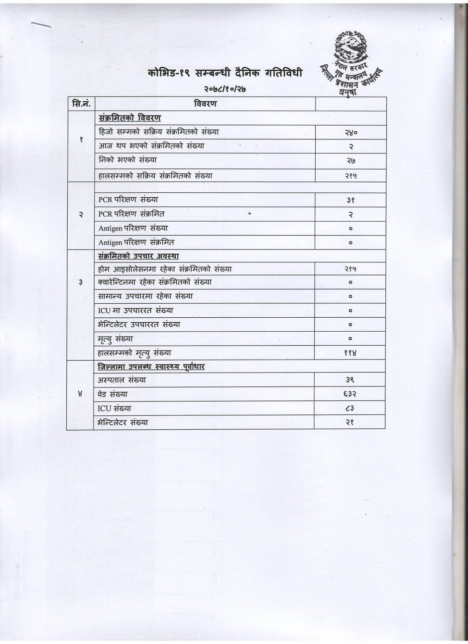 २०७८/१०/२७ काेभिड १९ सम्बन्धी दैनिक गतिविधी