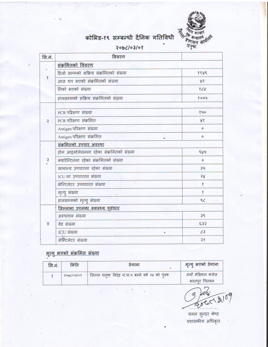 २०७८/०३/०१ काेभिड १९ सम्बन्धी दैनिक गतिविधी