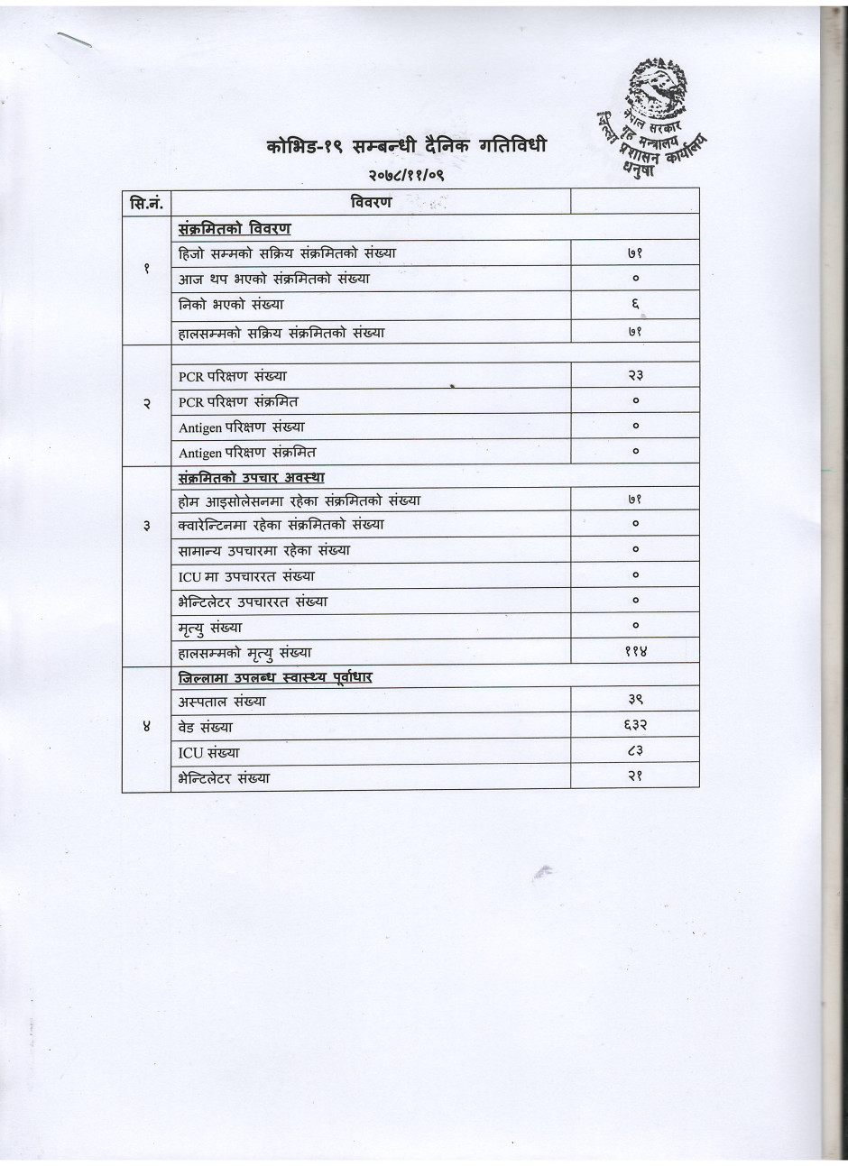 २०७८/११/०९ काेभिड १९ सम्बन्धी दैनिक गतिविधी