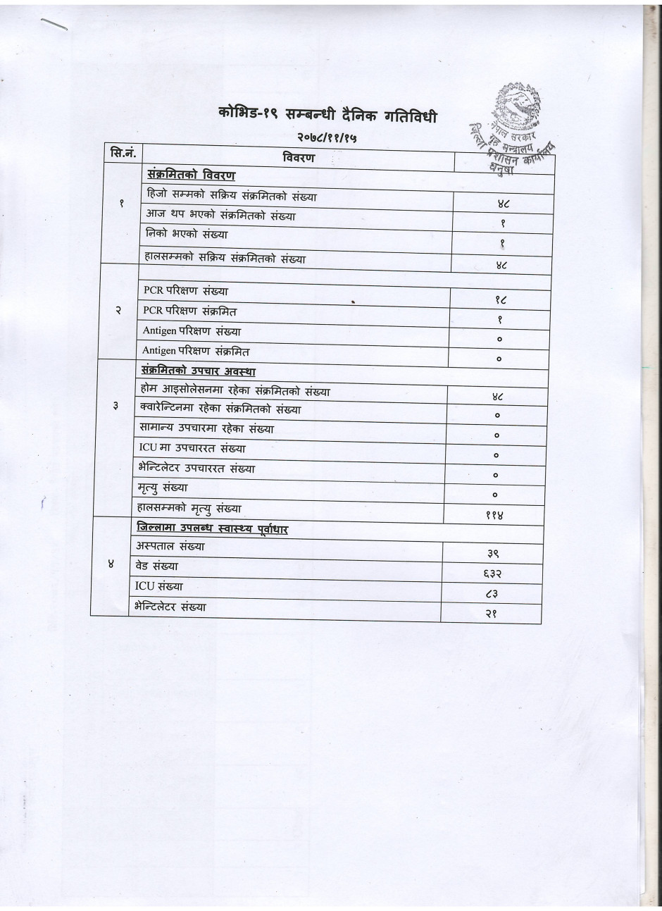 २०७८/११/१५ काेभिड १९ सम्बन्धी दैनिक गतिविधी