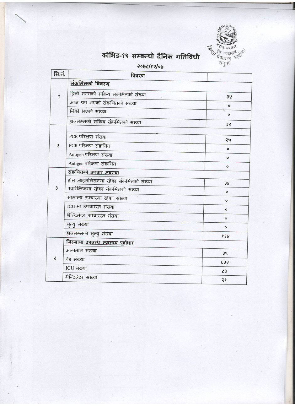 २०७८/१२/०७ काेभिड १९ सम्बन्धी दैनिक गतिविधी