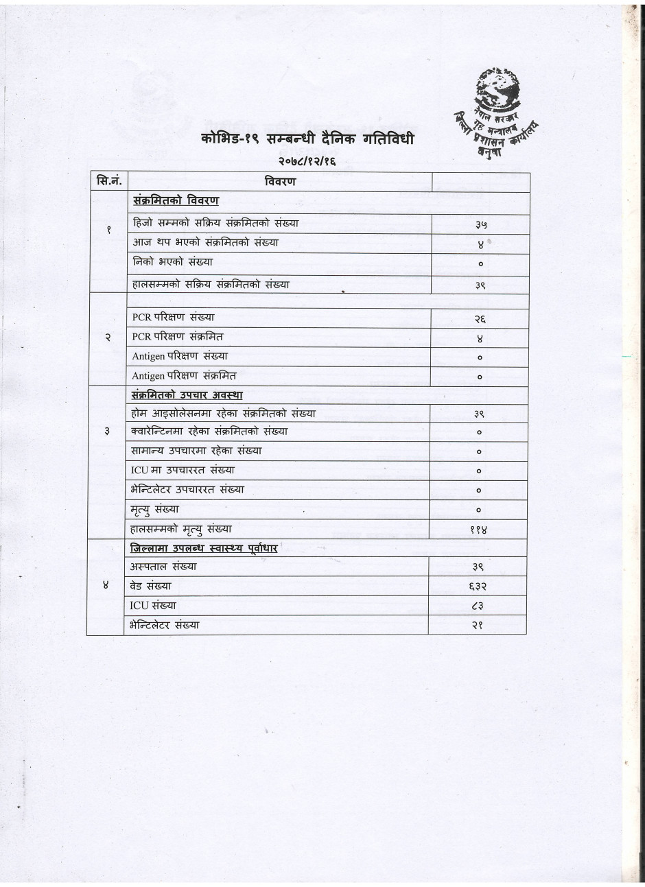 २०७८/१२/१६ काेभिड १९ सम्बन्धी दैनिक गतिविधी