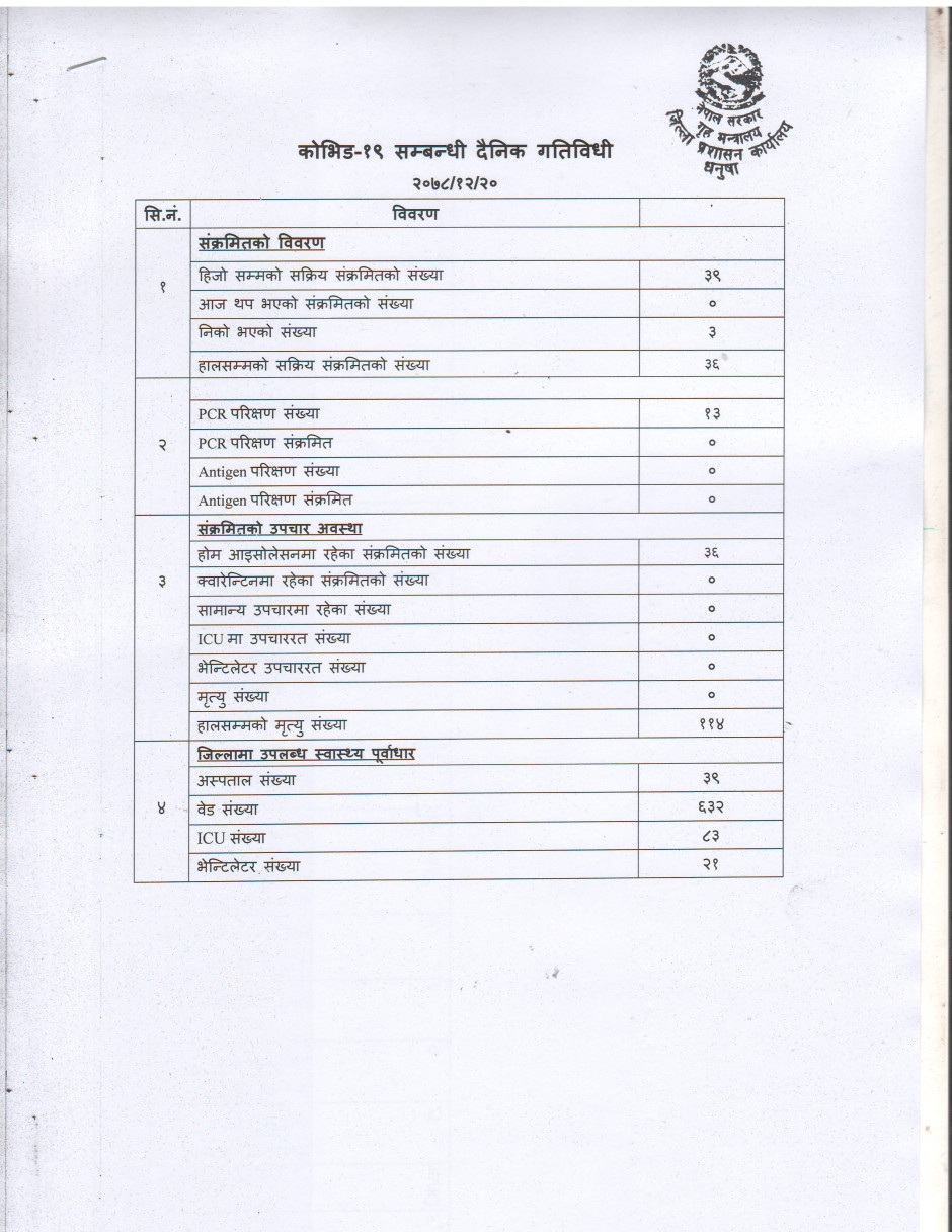 २०७८/१२/२० काेभिड १९ सम्बन्धी दैनिक गतिविधी