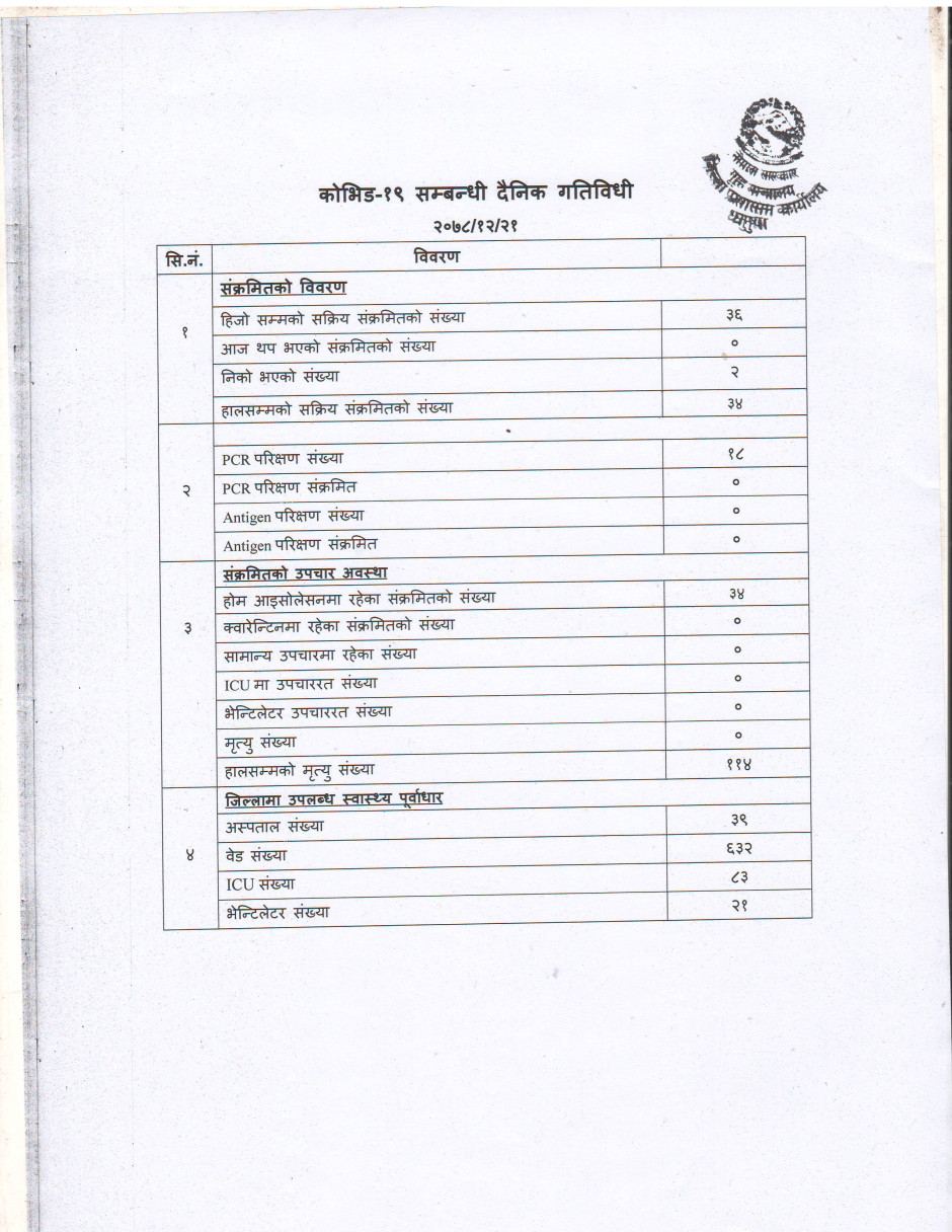 २०७८/१२/२१ काेभिड १९ सम्बन्धी दैनिक गतिविधी