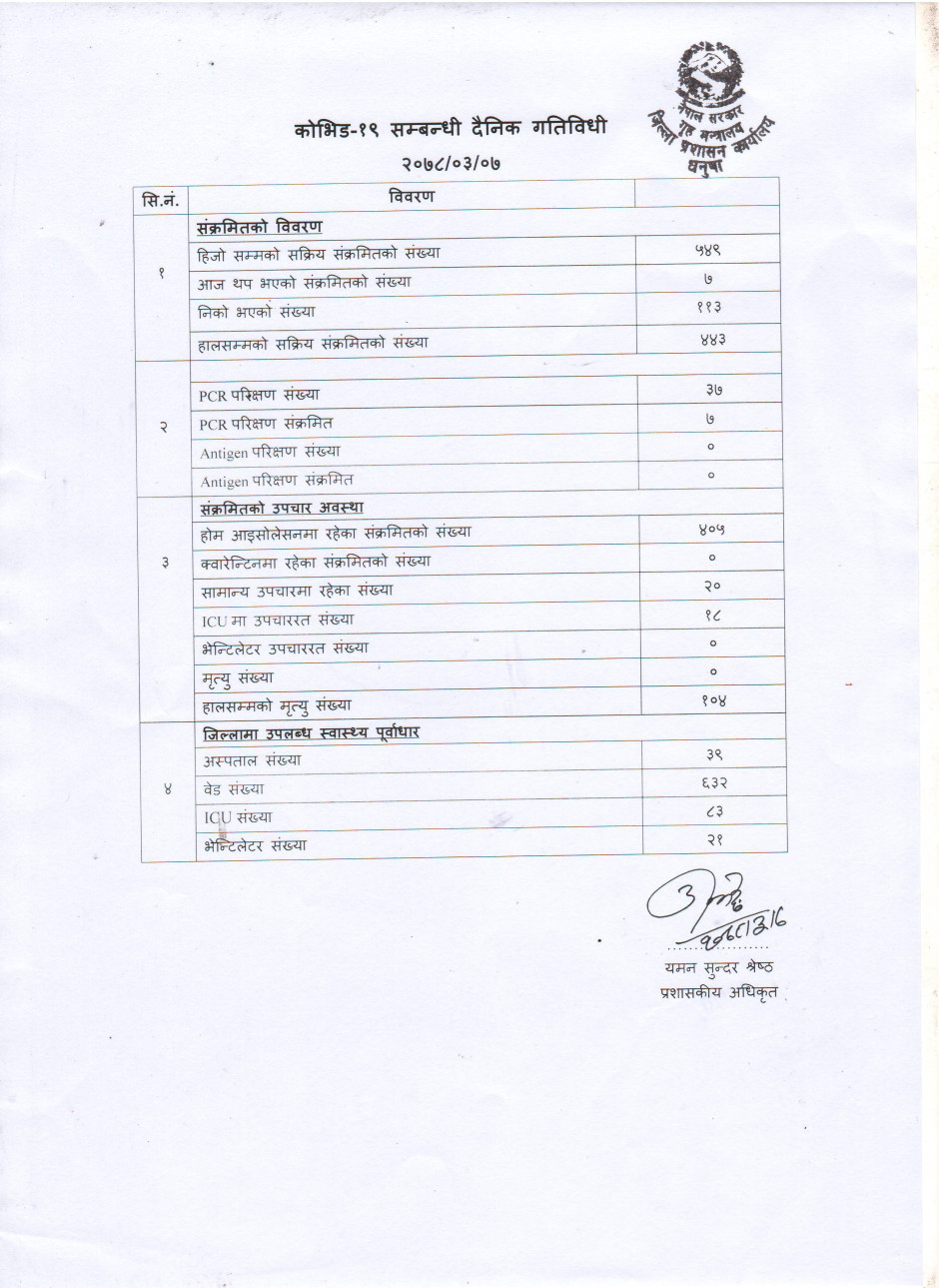 २०७८/०३/०७ काेभिड १९ सम्बन्धी दैनिक गतिविधी