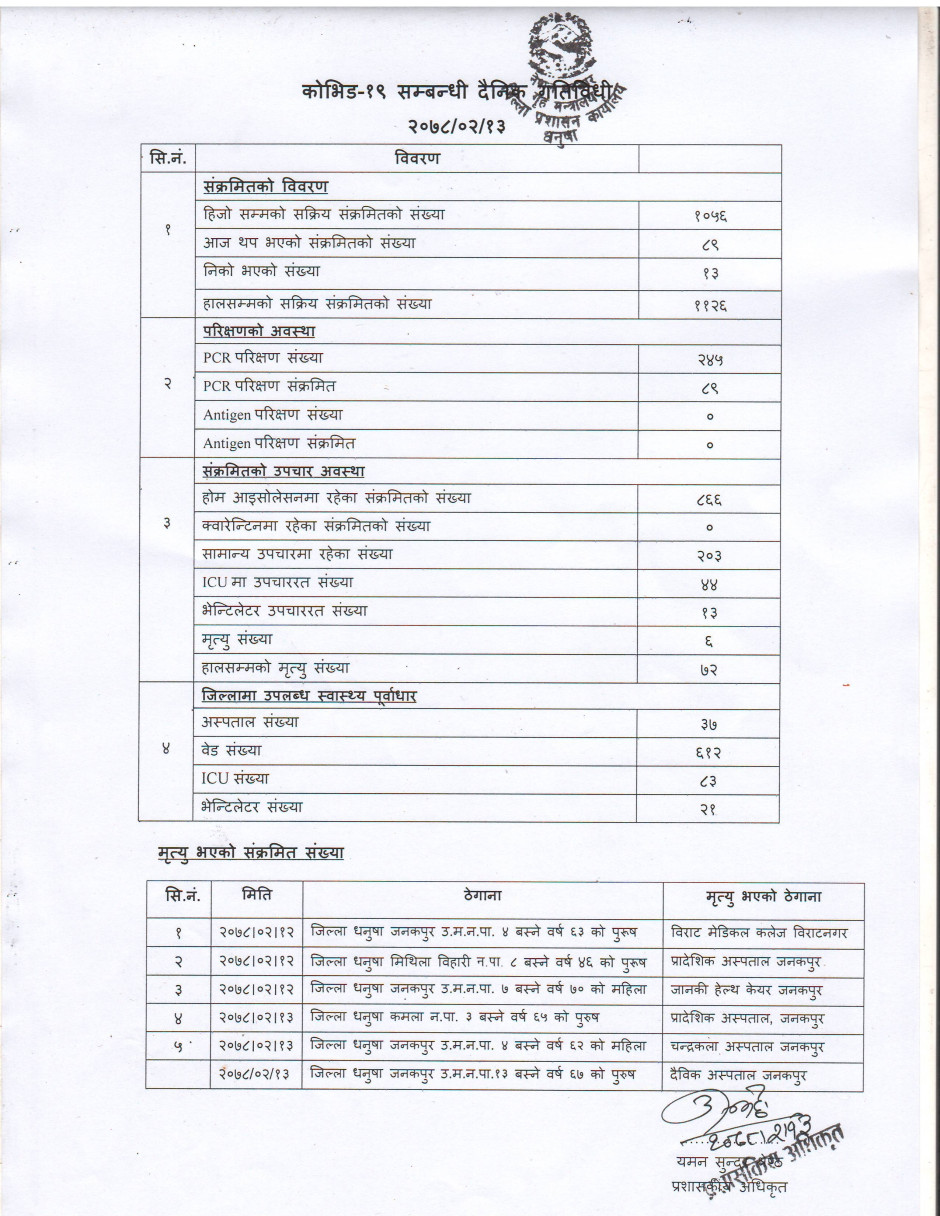 २०७८/०२/१३ काेभिड १९ सम्बन्धी दैनिक गतिविधी