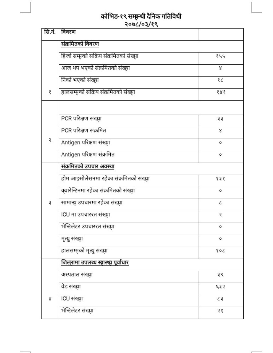 २०७८/०३/१९ काेभिड १९ सम्बन्धी दैनिक गतिविधी