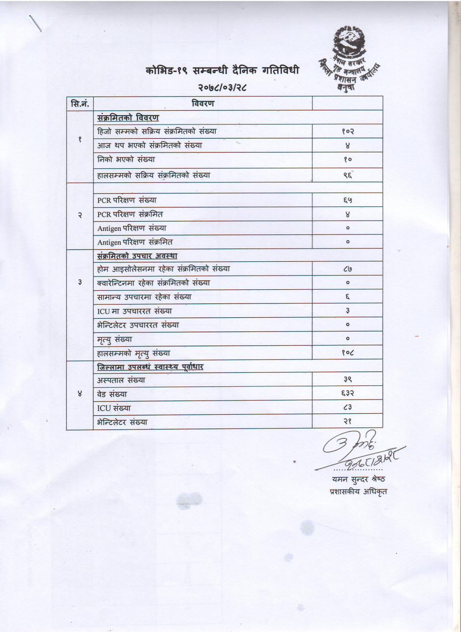 २०७८/०३/२८ काेभिड १९ सम्बन्धी दैनिक गतिविधी