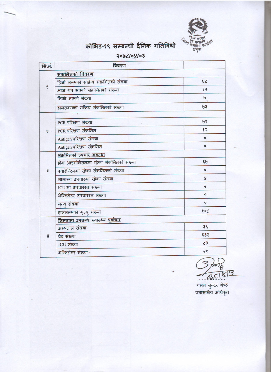 २०७८/०४/०३ काेभिड १९ सम्बन्धी दैनिक गतिविधी