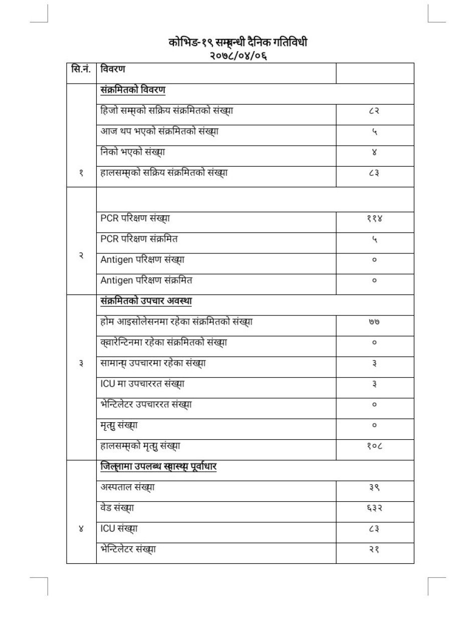 २०७८/०४/०६ काेभिड १९ सम्बन्धी दैनिक गतिविधी