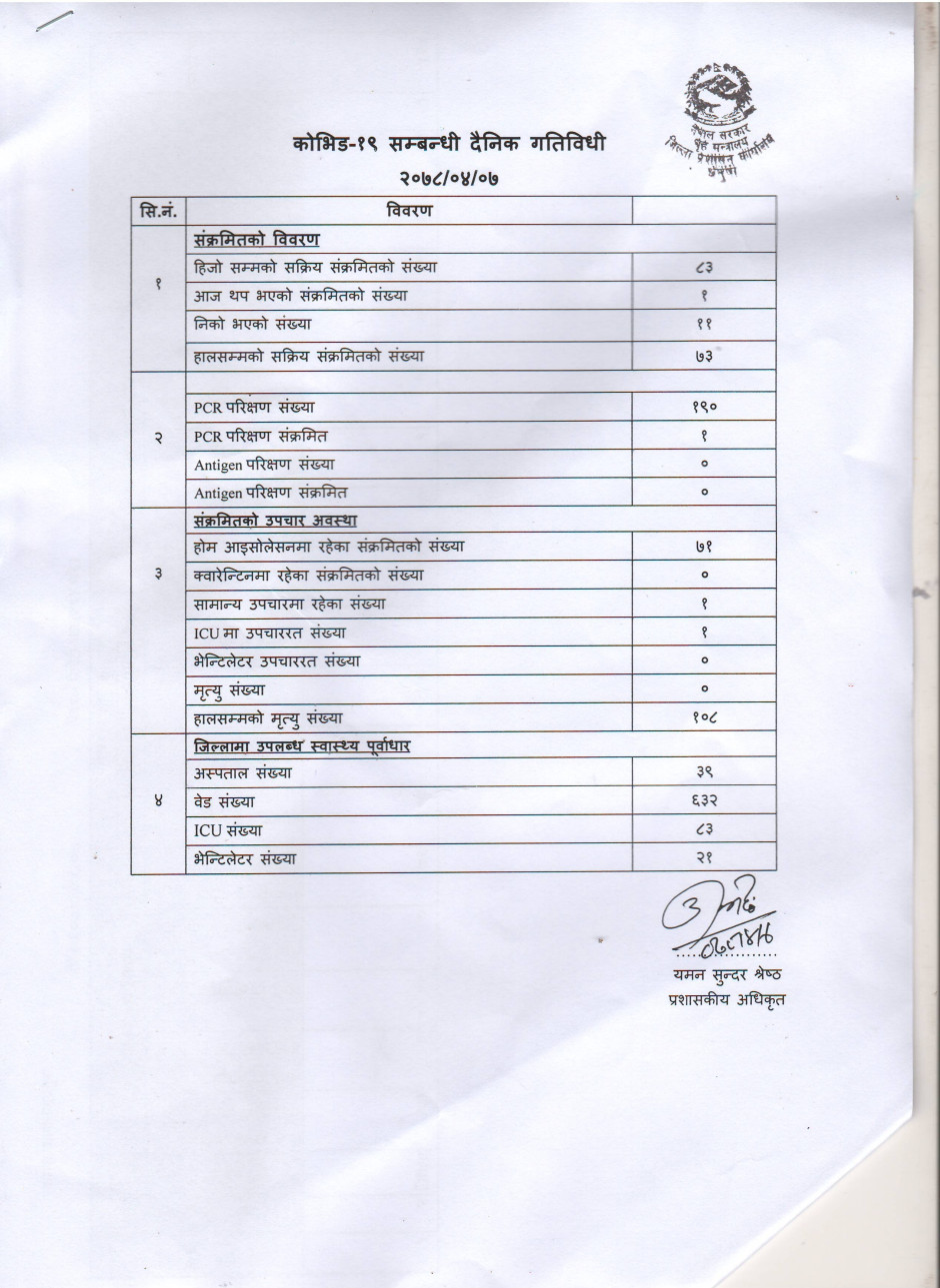 २०७८/०४/०७ काेभिड १९ सम्बन्धी दैनिक गतिविधी