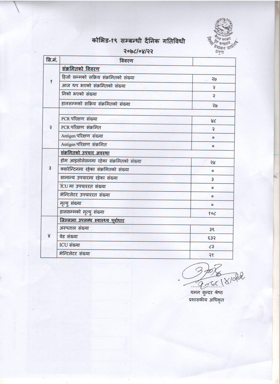 २०७८/०४/२२ काेभिड १९ सम्बन्धी दैनिक गतिविधी