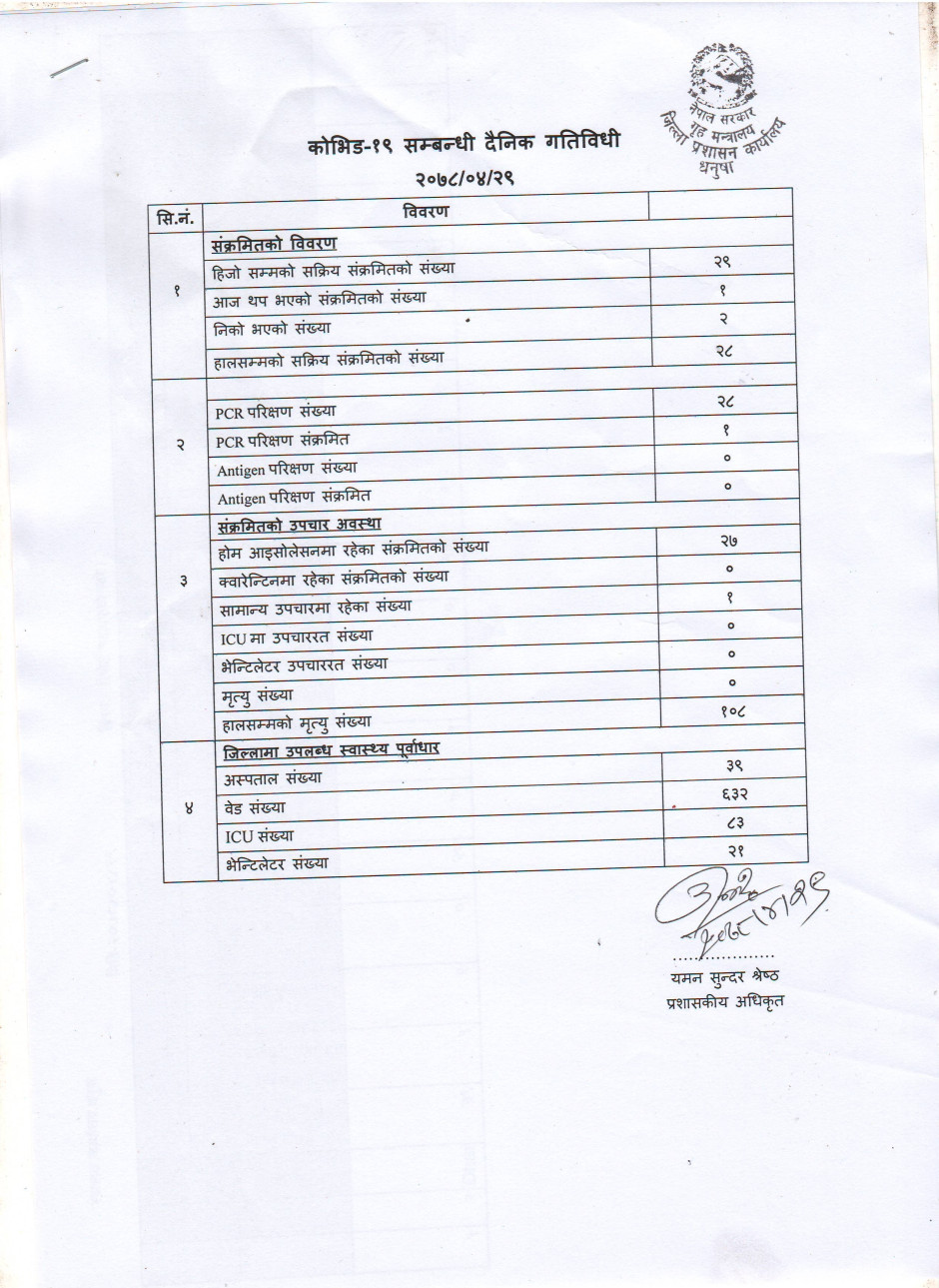 २०७८/०४/२९ काेभिड १९ सम्बन्धी दैनिक गतिविधी