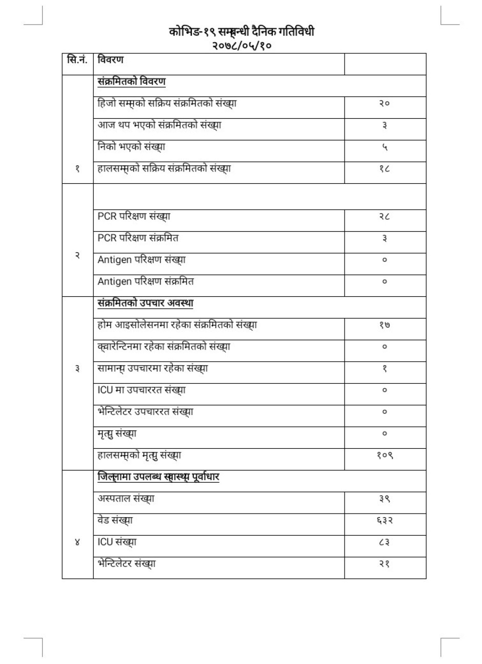 २०७८/०५/१० काेभिड १९ सम्बन्धी दैनिक गतिविधी