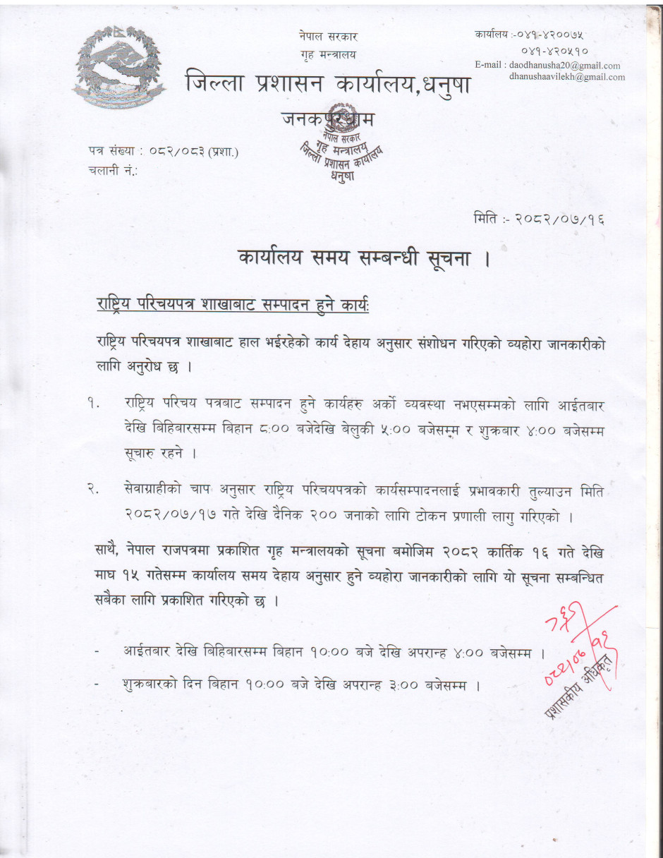 मिति २०८२/१२/२३ गते देखि लागु हुने गरी कार्यालय समय निर्धारण भएको ब्यवस्थाबारे नेपाल राजपत्रमा प्रकाशित सूचना