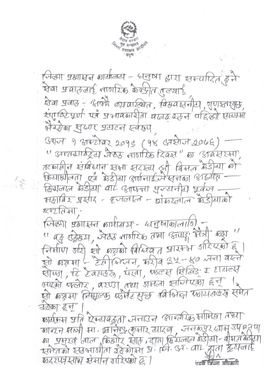 मिति २०७६ असोज १४ गतेका दिन ''अन्तराष्ट्रिय जेष्ठ नागरिक दिवस'' को अवसरमा जिल्ला प्रशासन कार्यालय धनुषाका परिसर स्थित ''बहुउद्देश्य,जेष्ठ नागरिक तथा अपाङ्ग मैत्री केडीया कक्ष'' हस्तान्तरण कार्यक्रम