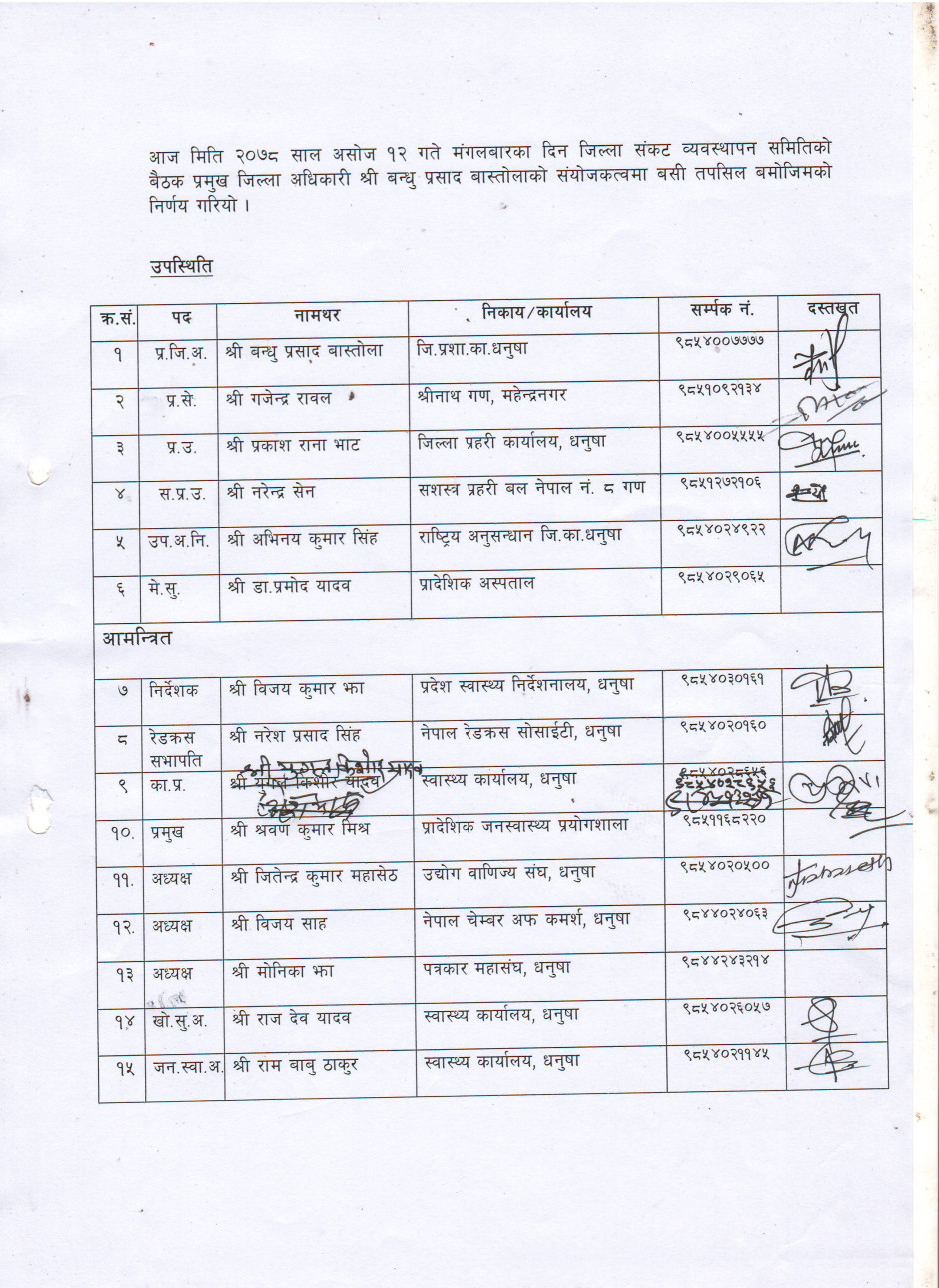 धनुषा जिल्लामा धार्मिक सहिष्णुता एवं सामाजिक सदभाव कायम राख्न जिल्लास्थित सुरक्षा निकायका पदाधिकारीहरु, जिल्लास्थित राजनितीक दल, जनकपुर उद्योग वाणिज्य संघ, जिल्ला पत्रकार महासंघ, सामाजिक साँस्कृतिक एवं धार्मिक क्षेत्रका अगुवाहरु सँग भएको बैठकको निर्णय