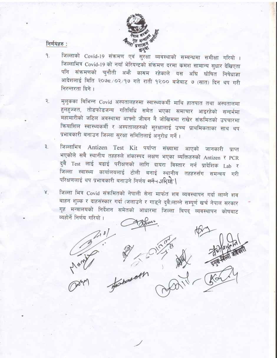 मिति २०७८/०२/१७ गते बसेको जिल्ला काेभिड व्यवस्थापन समिति बैठकबाट भएको निर्णय