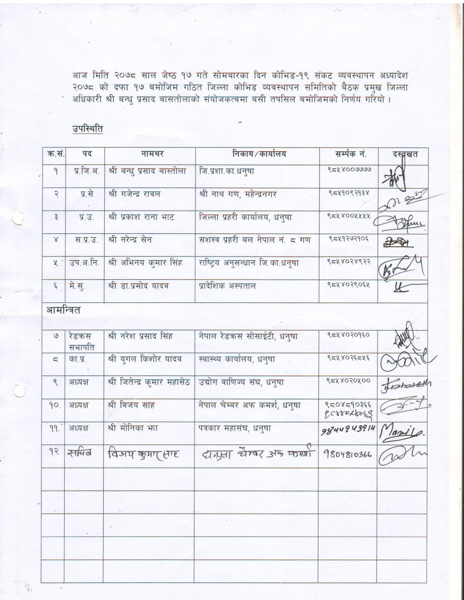 धनुषा जिल्लामा धार्मिक सहिष्णुता एवं सामाजिक सदभाव कायम राख्न जिल्लास्थित सुरक्षा निकायका पदाधिकारीहरु, जिल्लास्थित राजनितीक दल, जनकपुर उद्योग वाणिज्य संघ, जिल्ला पत्रकार महासंघ, सामाजिक साँस्कृतिक एवं धार्मिक क्षेत्रका अगुवाहरु सँग भएको बैठकको निर्णय