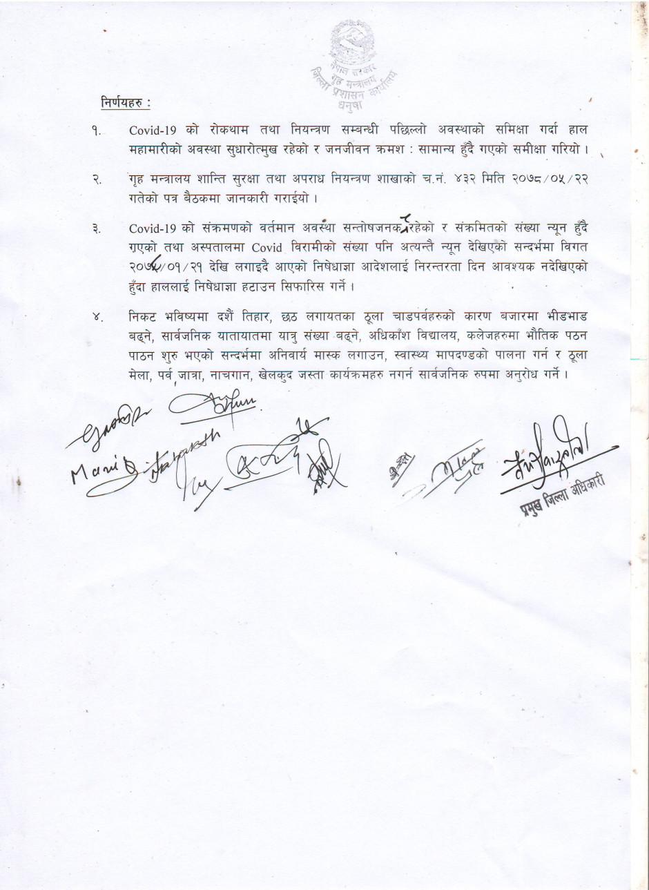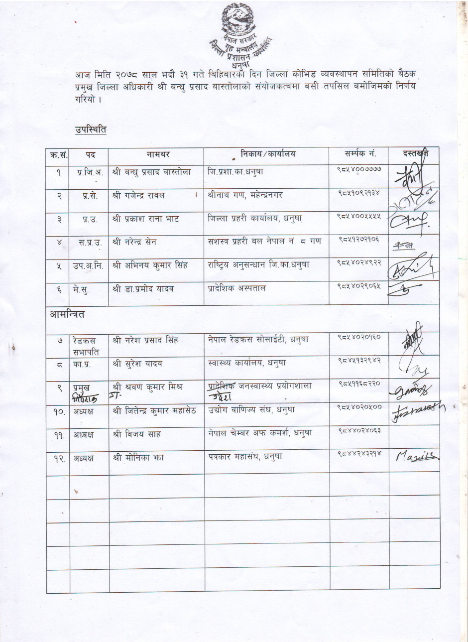 धनुषा जिल्लामा धार्मिक सहिष्णुता एवं सामाजिक सदभाव कायम राख्न जिल्लास्थित सुरक्षा निकायका पदाधिकारीहरु, जिल्लास्थित राजनितीक दल, जनकपुर उद्योग वाणिज्य संघ, जिल्ला पत्रकार महासंघ, सामाजिक साँस्कृतिक एवं धार्मिक क्षेत्रका अगुवाहरु सँग भएको बैठकको निर्णय