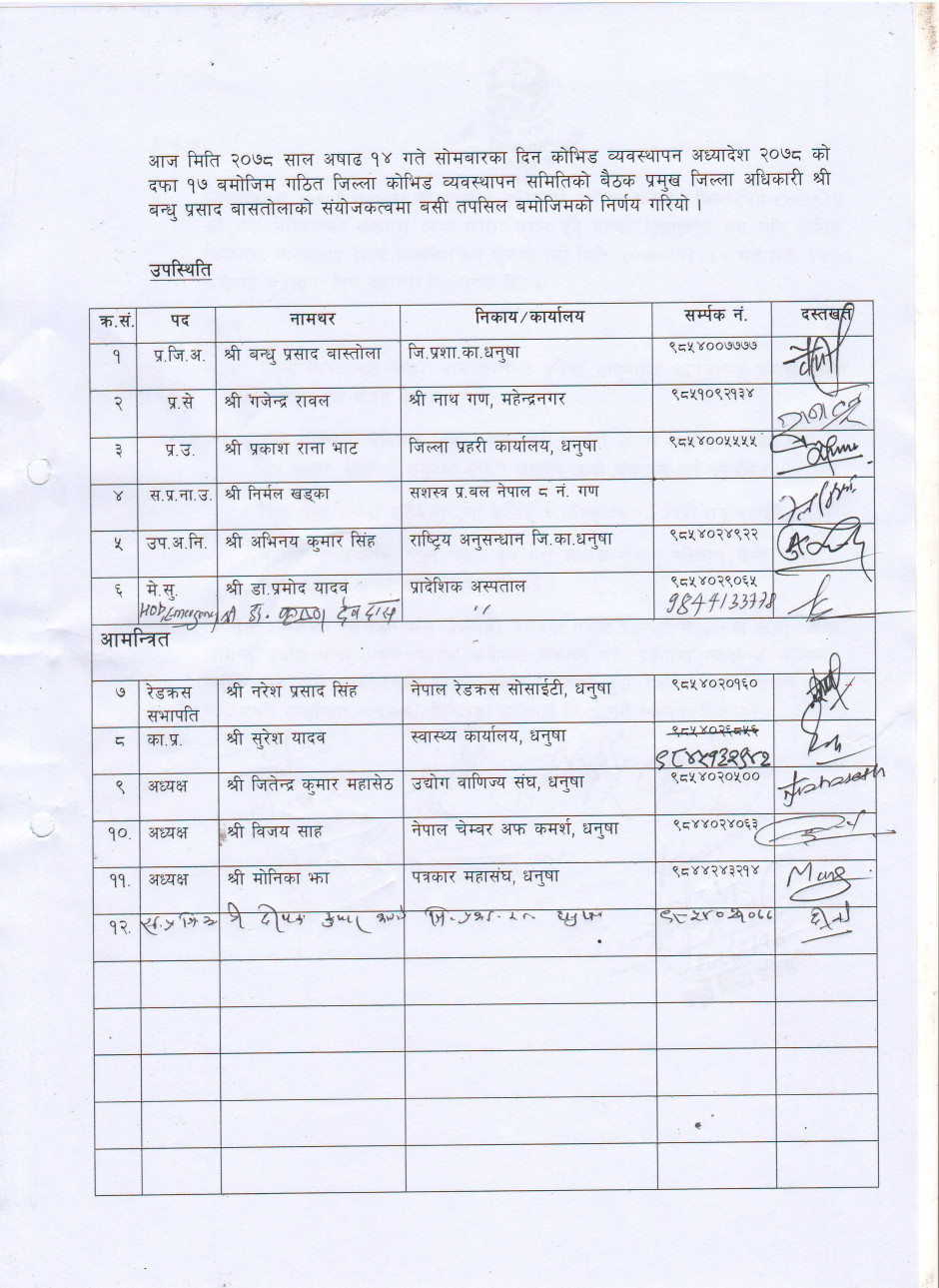 धनुषा जिल्लामा धार्मिक सहिष्णुता एवं सामाजिक सदभाव कायम राख्न जिल्लास्थित सुरक्षा निकायका पदाधिकारीहरु, जिल्लास्थित राजनितीक दल, जनकपुर उद्योग वाणिज्य संघ, जिल्ला पत्रकार महासंघ, सामाजिक साँस्कृतिक एवं धार्मिक क्षेत्रका अगुवाहरु सँग भएको बैठकको निर्णय