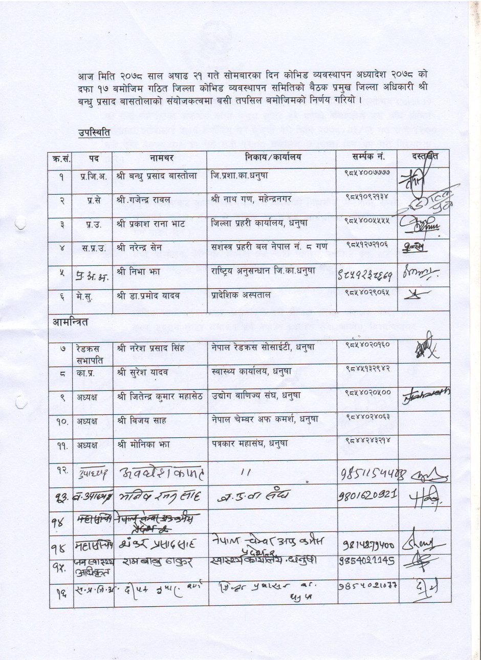 धनुषा जिल्लामा धार्मिक सहिष्णुता एवं सामाजिक सदभाव कायम राख्न जिल्लास्थित सुरक्षा निकायका पदाधिकारीहरु, जिल्लास्थित राजनितीक दल, जनकपुर उद्योग वाणिज्य संघ, जिल्ला पत्रकार महासंघ, सामाजिक साँस्कृतिक एवं धार्मिक क्षेत्रका अगुवाहरु सँग भएको बैठकको निर्णय