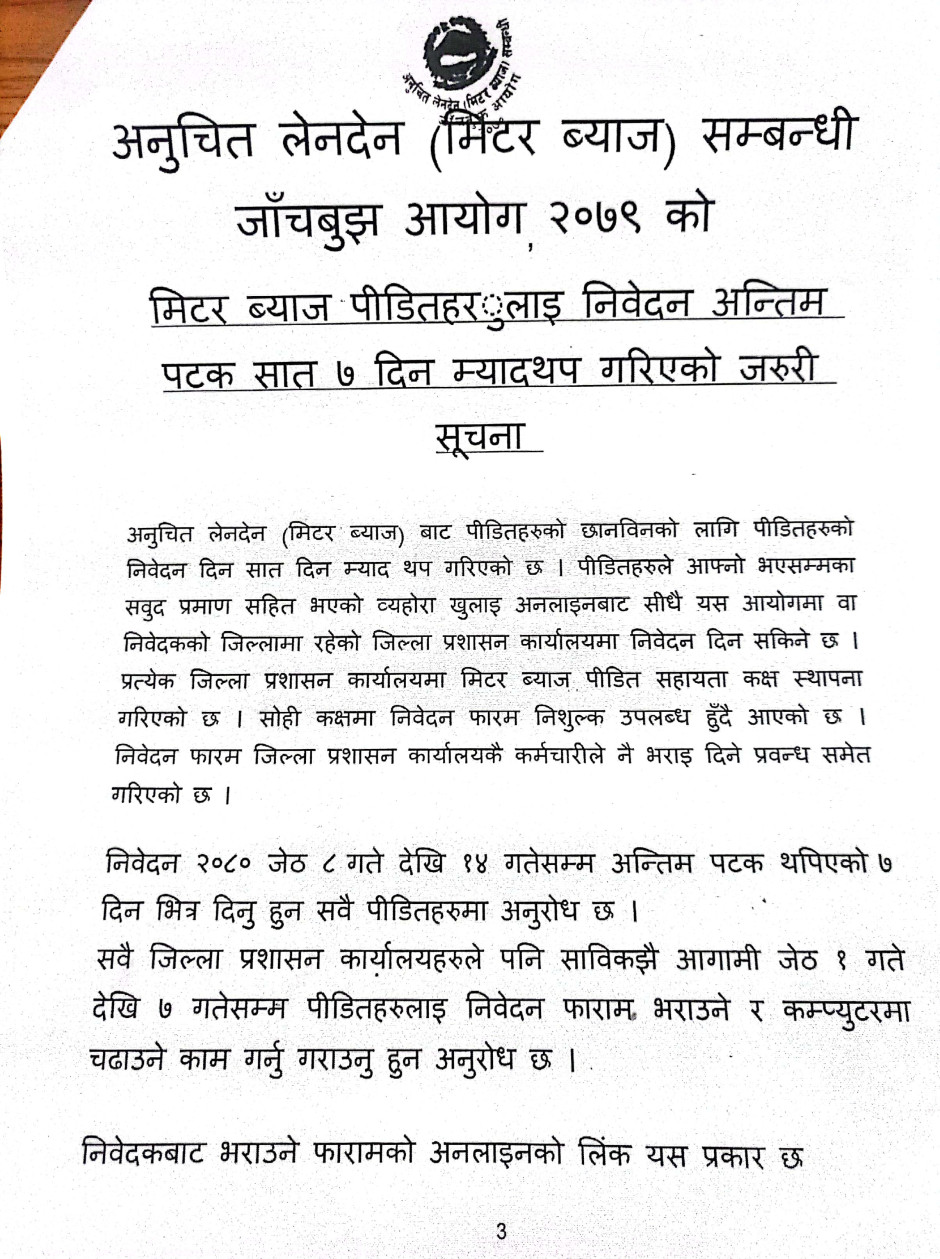 मिटरब्याज पीडितहरुलाई निवेदन अन्तिम पटक सात ७ दिन म्याद थप गरिएको जरुरी सूचना