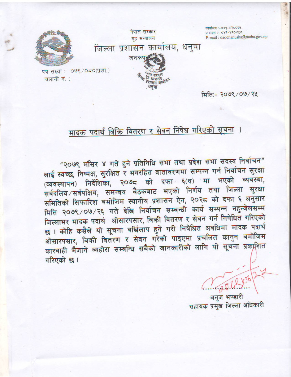 जिल्ला प्रशासन कार्यालय धनुषाबाट जारी गरिएको सूचना ।
