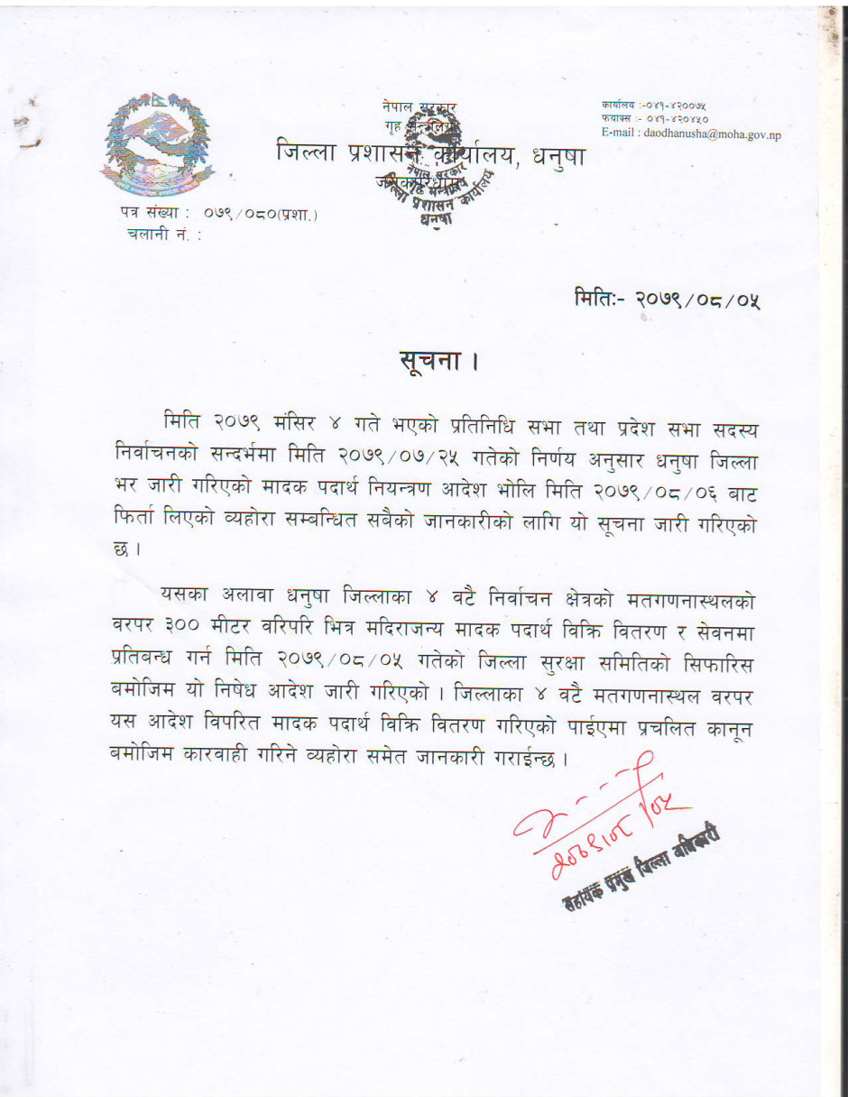 जिल्ला प्रशासन कार्यालय धनुषाबाट जारी गरिएको सूचना ।