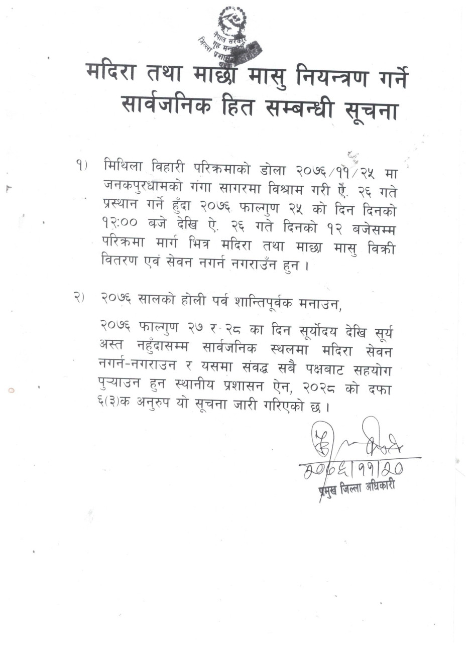 मदिरा तथा माछा मासु नियन्त्रण गर्ने सार्वजनिक हित सम्बन्धी सूचना