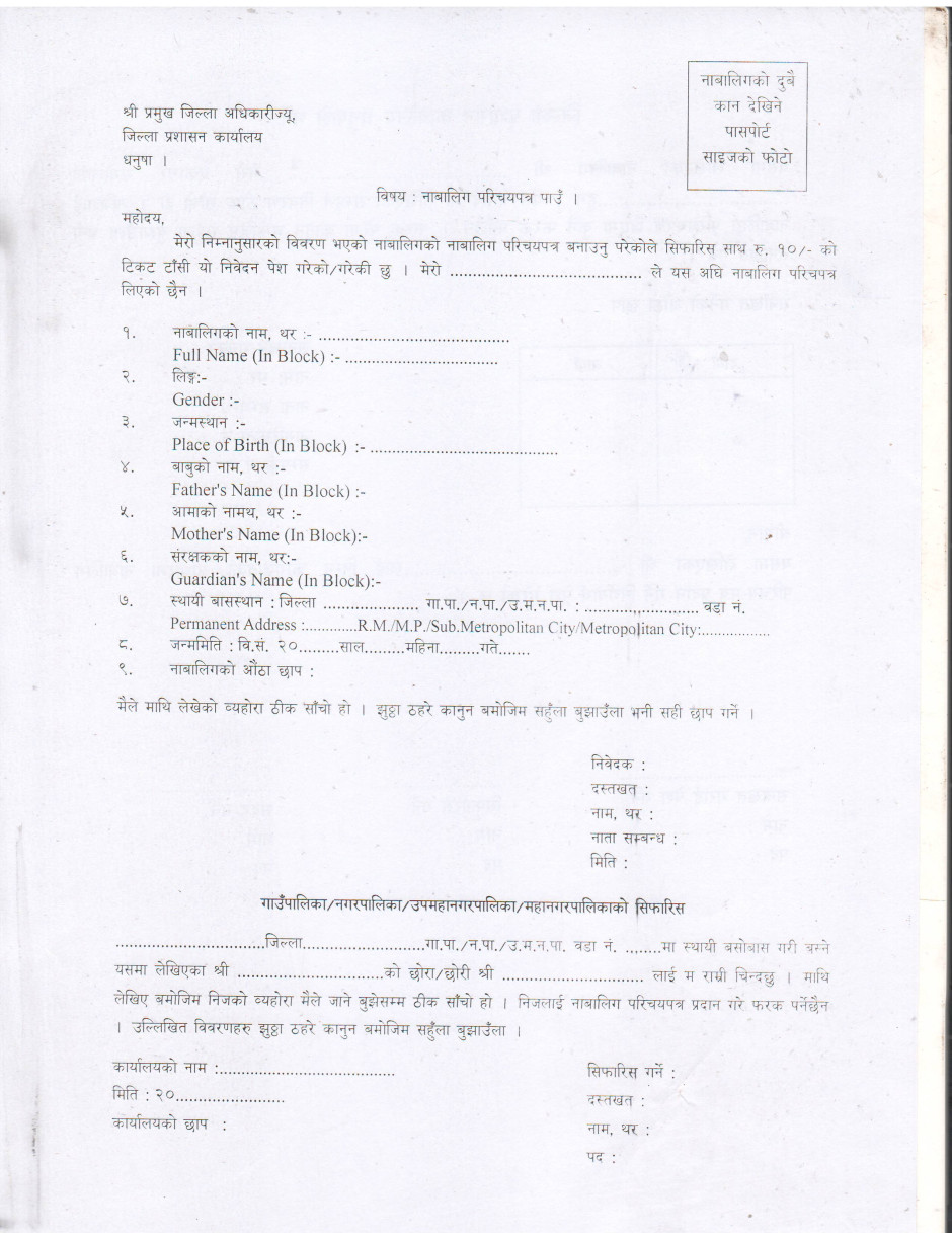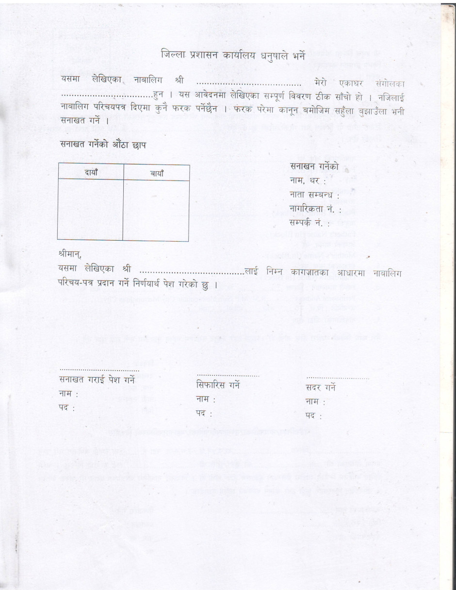 नाबालक परिचय पत्रको निवेदनको ढाँचा