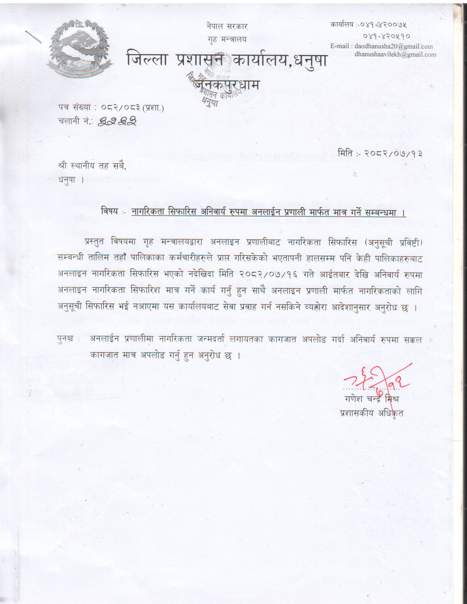 नागरिकता सिफारिस अनिवार्य रुपमा अनलाईन प्रणाली मार्फत मात्र गर्ने सम्बन्धमा ।