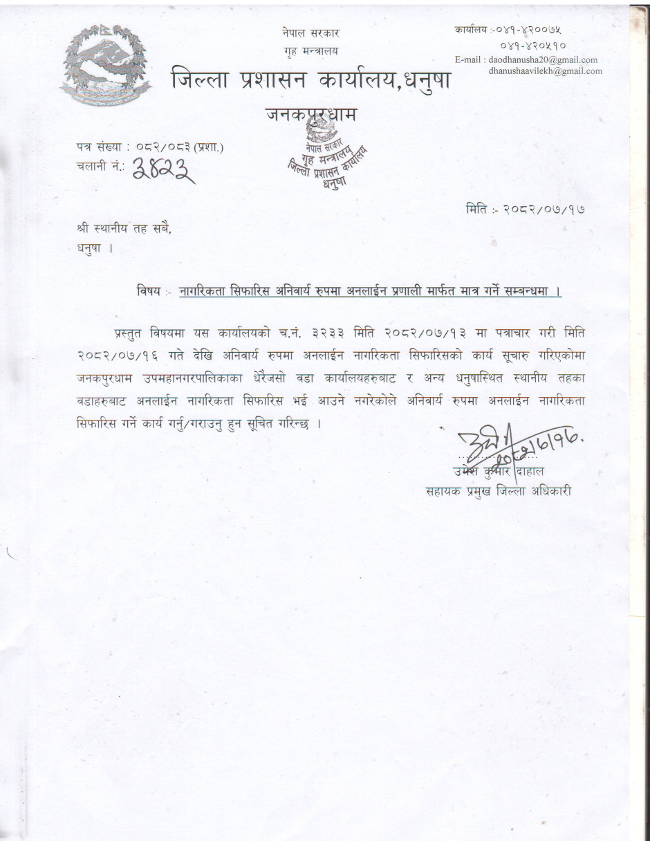 जिल्ला प्रशासन कार्यालय धनुषाबाट जारी गरिएको सूचना ।