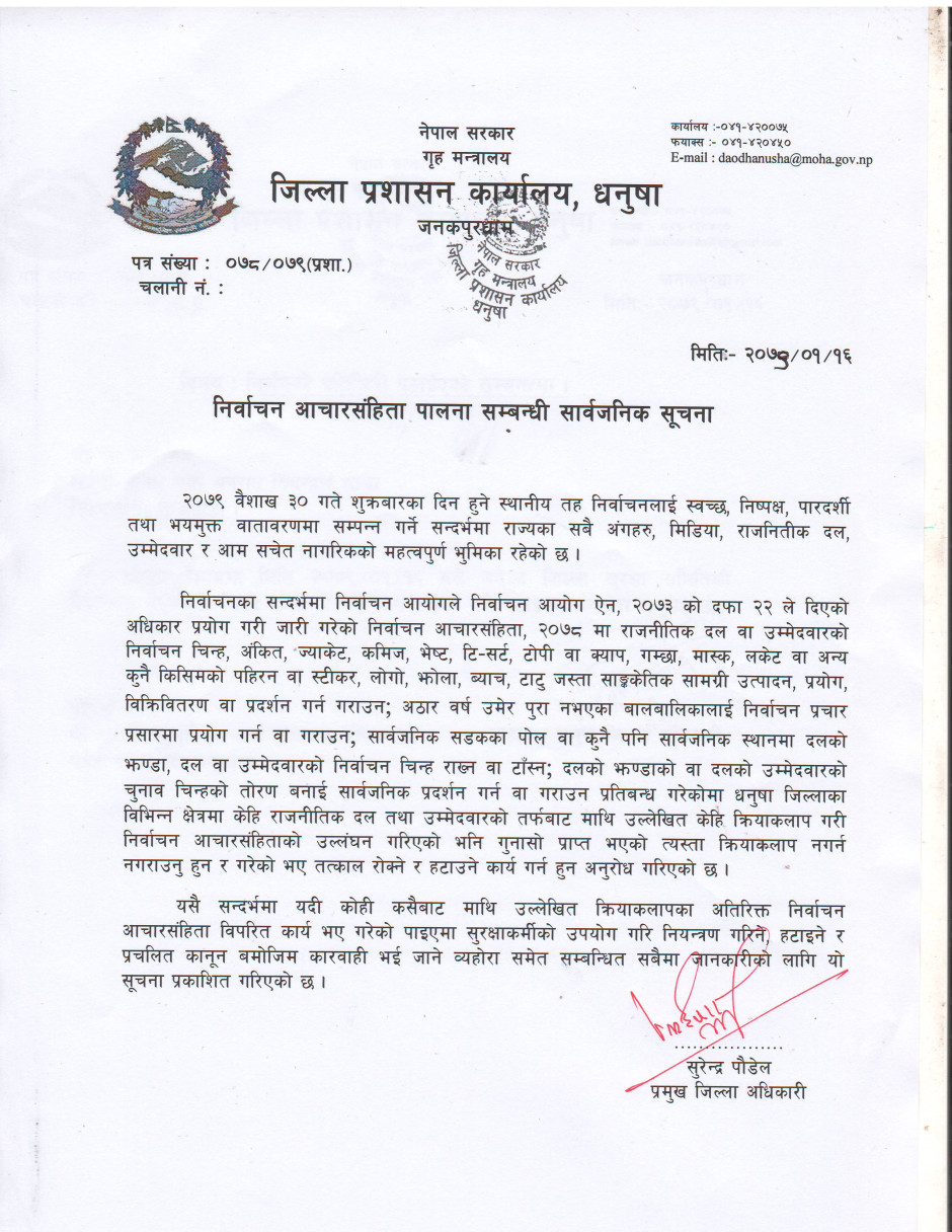 मिति २०८२/१०/२७ गते धनुषा जिल्लाको निर्वाचन क्षेत्र नं. 1, 3 र ४ मा अनुगमन गर्दा निर्वाचन आचारसंहिता विपरित चुनाव प्रचार प्रसार गरिएको पाइएकाले कारवाही गरिएको छ