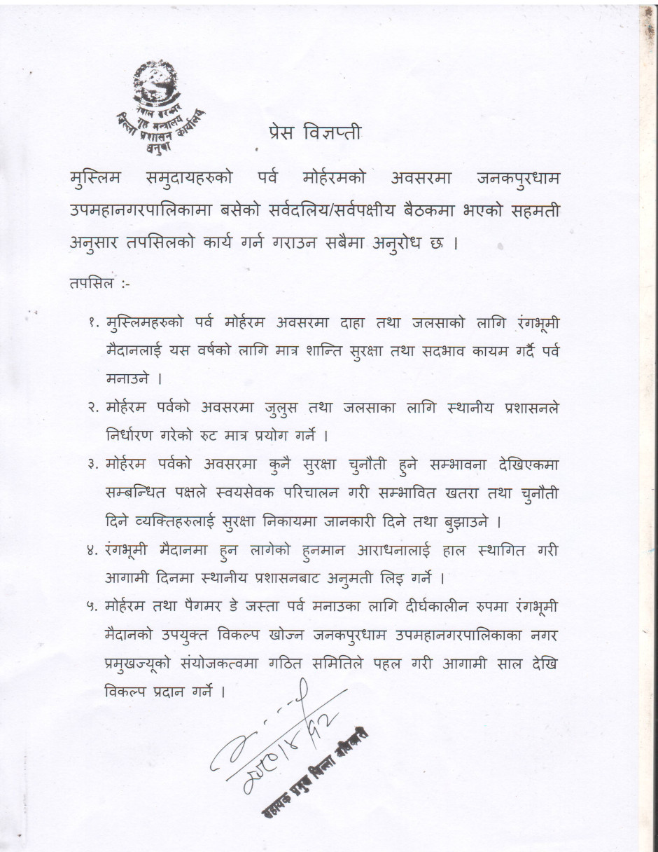धनुषा जिल्लामा धार्मिक सहिष्णुता एवं सामाजिक सदभाव कायम राख्न जिल्लास्थित सुरक्षा निकायका पदाधिकारीहरु, जिल्लास्थित राजनितीक दल, जनकपुर उद्योग वाणिज्य संघ, जिल्ला पत्रकार महासंघ, सामाजिक साँस्कृतिक एवं धार्मिक क्षेत्रका अगुवाहरु सँग भएको बैठकको निर्णय