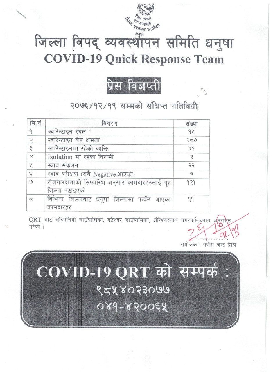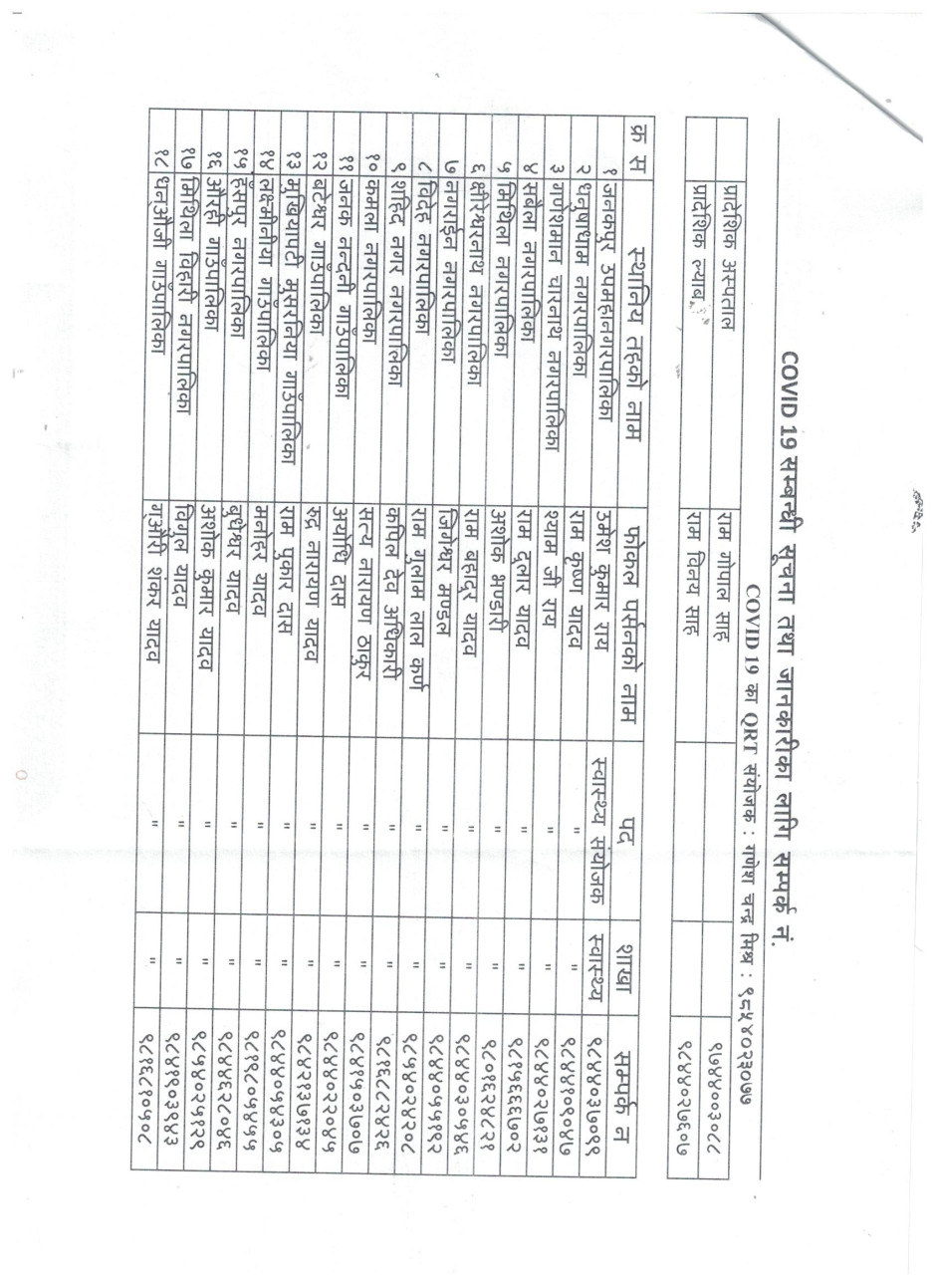 धनुषा जिल्लामा धार्मिक सहिष्णुता एवं सामाजिक सदभाव कायम राख्न जिल्लास्थित सुरक्षा निकायका पदाधिकारीहरु, जिल्लास्थित राजनितीक दल, जनकपुर उद्योग वाणिज्य संघ, जिल्ला पत्रकार महासंघ, सामाजिक साँस्कृतिक एवं धार्मिक क्षेत्रका अगुवाहरु सँग भएको बैठकको निर्णय