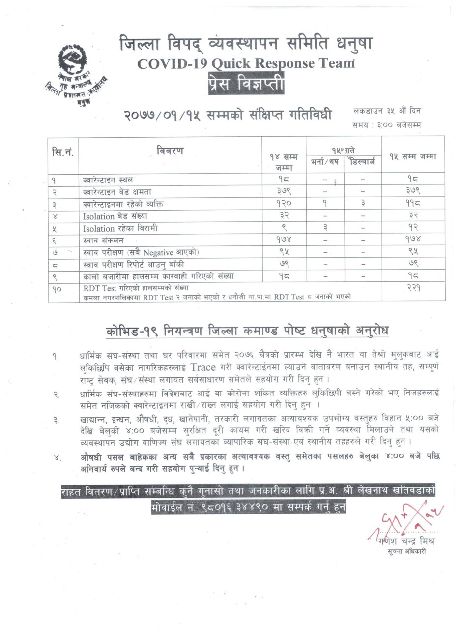 धनुषा जिल्लामा धार्मिक सहिष्णुता एवं सामाजिक सदभाव कायम राख्न जिल्लास्थित सुरक्षा निकायका पदाधिकारीहरु, जिल्लास्थित राजनितीक दल, जनकपुर उद्योग वाणिज्य संघ, जिल्ला पत्रकार महासंघ, सामाजिक साँस्कृतिक एवं धार्मिक क्षेत्रका अगुवाहरु सँग भएको बैठकको निर्णय
