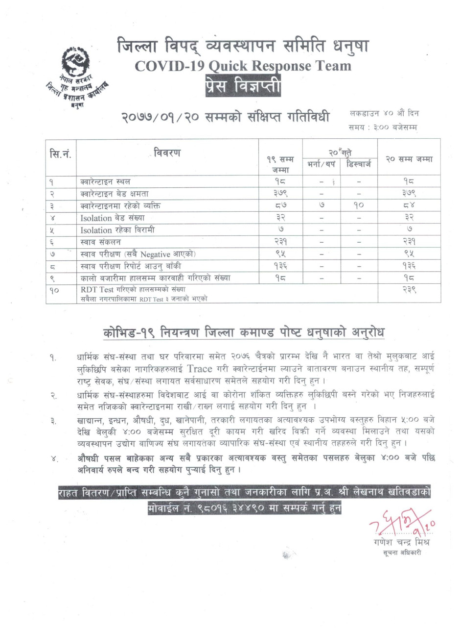 धनुषा जिल्लामा धार्मिक सहिष्णुता एवं सामाजिक सदभाव कायम राख्न जिल्लास्थित सुरक्षा निकायका पदाधिकारीहरु, जिल्लास्थित राजनितीक दल, जनकपुर उद्योग वाणिज्य संघ, जिल्ला पत्रकार महासंघ, सामाजिक साँस्कृतिक एवं धार्मिक क्षेत्रका अगुवाहरु सँग भएको बैठकको निर्णय